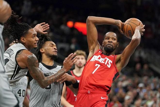 比赛一开场的跳球,申京压根就没跳。毕竟对面是文班亚马,也没必要费这个力气。但如果要说申京害怕文班亚马,那可不是。要知道申京职业生涯最高得分,就是面对文班亚马拿到的。而且火箭队和文班亚马之间,自选秀抽签的时候,关系就变得很微妙了。比赛期间,多个回合申京都要求队友拉开,自己背身单打文班亚马,还真能进!申京的篮下技术,确实是让文班亚马的封盖没有用武之地。而杜兰特,面对马刺队的防守开局显得很是慢热,投篮差得多。但这和火箭队的阵容配置也有关系,没有一个水准线上的控球后卫,杜兰特只能承担更多的组织工作。因此,在本就能吸引防守的基础上,对手更加变本加厉的针对。