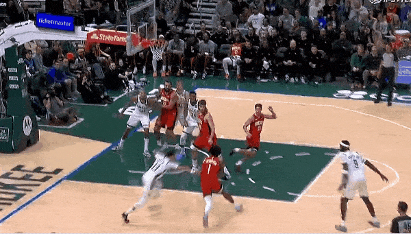 动作丝滑,一气呵成。你很难想象这是一个中锋会做的动作,没办法,这就是火箭的特权。